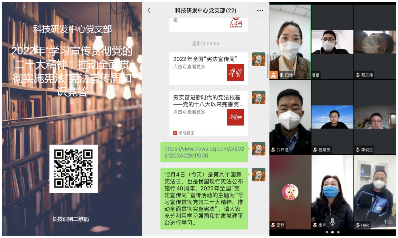12月4日至8日,科技研發中心黨支部圍繞“學習貫徹黨的二十大精神,推動全面貫徹實施憲法”主題,舉行了“憲法宣傳周”系列活動。組織干部職工集中學習了《憲法》《民法典》《公司法》《安全生產法》《中華人民共和國反電信網絡詐騙法》和《中華人民共和國科學技術進步法》等法律法規、開展憲法宣傳海報設計和憲法知識競答活動,督促引導廣大職工知法、學法、懂法、守法、用法,樹立憲法思維,筑牢法律防線,切實維護憲法權威,激發了廣大職工參與憲法學習的積極性和主動性。