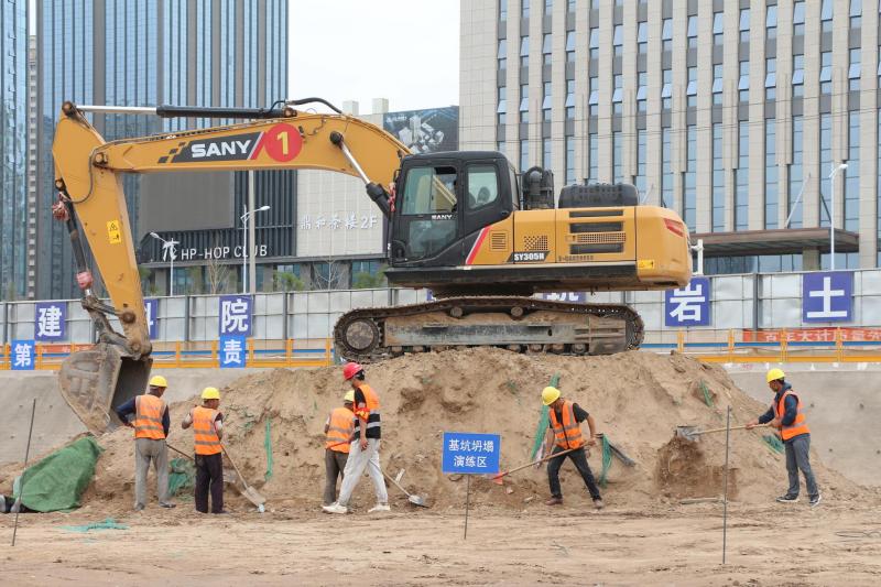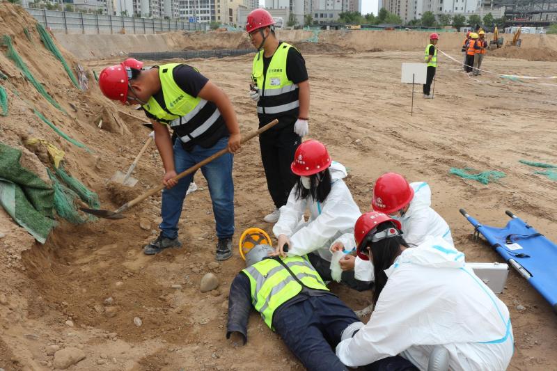 上午10時整,隨著王春景一聲令下,各作業區、部室及演練人員迅速到達指定區域開始模擬基坑塌陷演練。其設置情景是:勞務作業人員在現場作業期間發生土方塌方,該班組安全員發現了該作業人員被掩埋,立即上前進行施救,并快速將人員信息傳送至項目部應急領導小組,報告塌方事故的時間、地點等信息。現場指揮根據事故情況宣布啟動應急預案,立即通知項目部醫療小組、安全小組帶上擔架、藥箱、警戒線立刻趕往現場準備警戒施救工作,通知救護車輛進場待命。