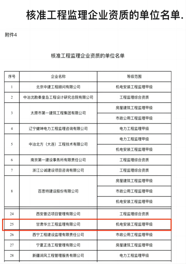 2023年新年伊始,甘肅建科院全資子公司華蘭工程監理有限公司近日成功取得住房和城鄉建設部頒發的機電安裝工程監理甲級資質。