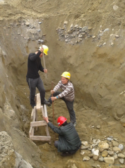 圖1 以往施工單位人工釬探 圖2 我院改進后人工釬探