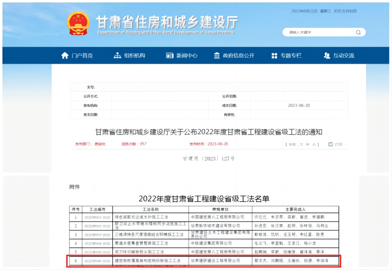 近日,甘肅省住房和城鄉建設廳發布《關于公布2022年度甘肅省工程建設省級工法的通知》,建研建設公司申報的《建筑物附屬高聳構筑物拆除施工工法》獲批2022年度甘肅省工程建設省級工法,也是公司獲批的第四項省級工法。