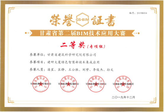 大會為省建科院頒發了甘肅省第二屆 BIM 技術應用大賽專項組二等獎榮譽證書。由甘肅省建筑業聯合會、甘肅省勘察設計協會、甘肅省建設監理協會、甘肅省建筑職教集團、甘肅建筑職業技術學院、甘肅益埃畢建筑科技有限公司共同舉辦的甘肅省第二屆 BIM 技術應用大賽,旨在進一步促進 BIM 技術在我省工程建設領域的普及應用,鼓勵創新實踐,弘揚創新文化,加速建筑類高校 BIM人才培養。在本次大賽中,省建科院“建研大廈綠色智慧新技術集成應用”項目通過初審、終審答辯等環節,獲得了專項組二等獎。