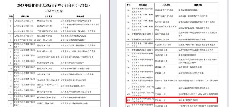 近日,在甘肅省第43次質量管理小組活動年會暨成果交流會上,由甘肅建科院設計分院申報的2023年度甘肅省優秀質量管理小組活動課題“提高設計圖紙的準確率”獲得省級三等獎。