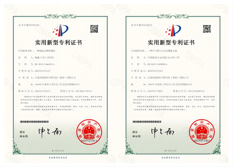 近日,地基巖土專業事業部申報的“一種地基沉降檢測儀”和“一種可升降式全站儀測量支架”兩項實用新型專利正式獲得國家知識產權局審核并授予專利通知。