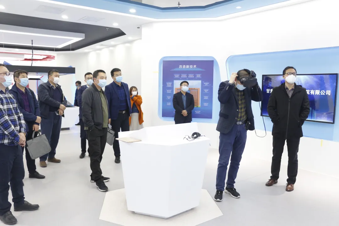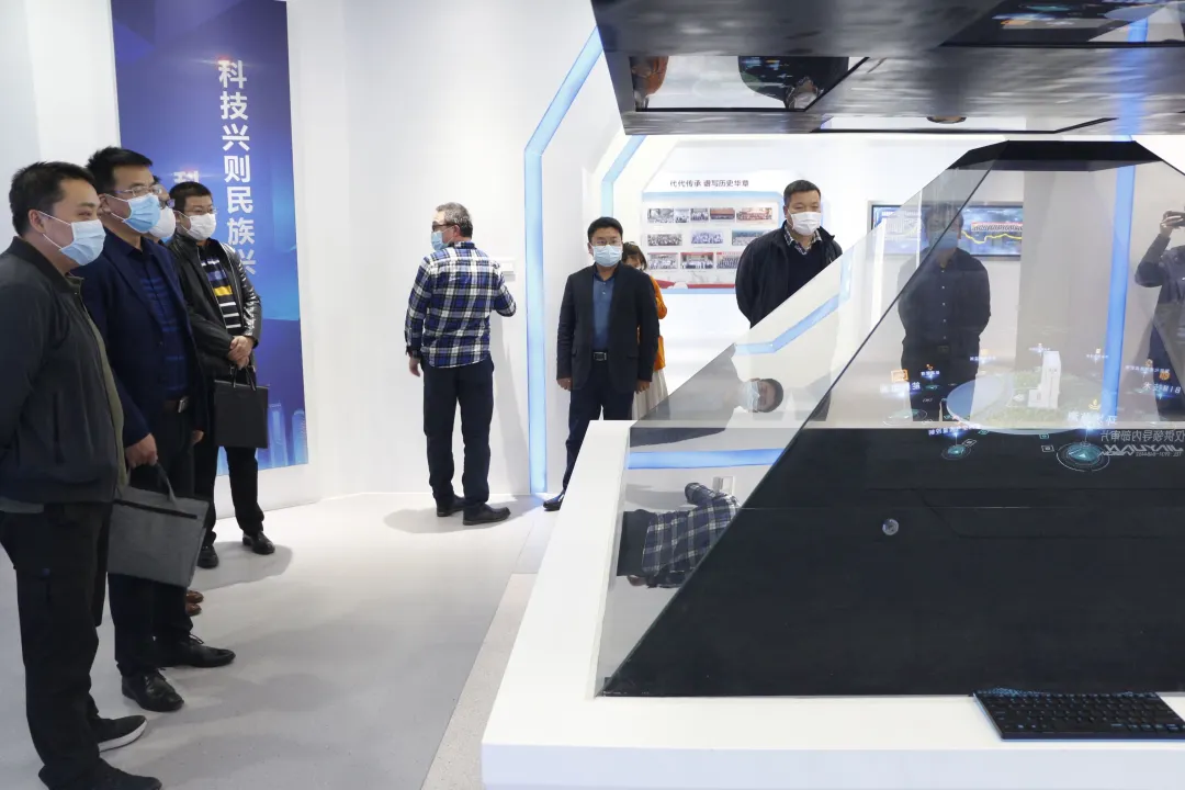 座談會前,在副總經理袁寧的帶領下,副總經理韓成海一行參觀了建研大廈一樓展廳,工作人員對建研大廈應用的IBMS系統、BIM+VR、全息投影等十余項新技術進行了詳細介紹。