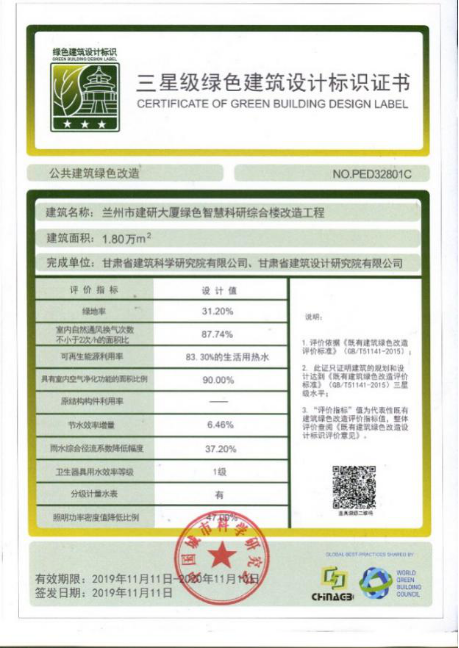 按照《既有建筑綠色改造評價標準》(GB/T 51141-2015),建研大廈綠色改造工程項目評分項達到80分以上,滿足綠色建筑三星要求。經(jīng)過專家組評審、社會公示,甘肅省建筑科學研究院有限公司建研大廈項目獲此殊榮。