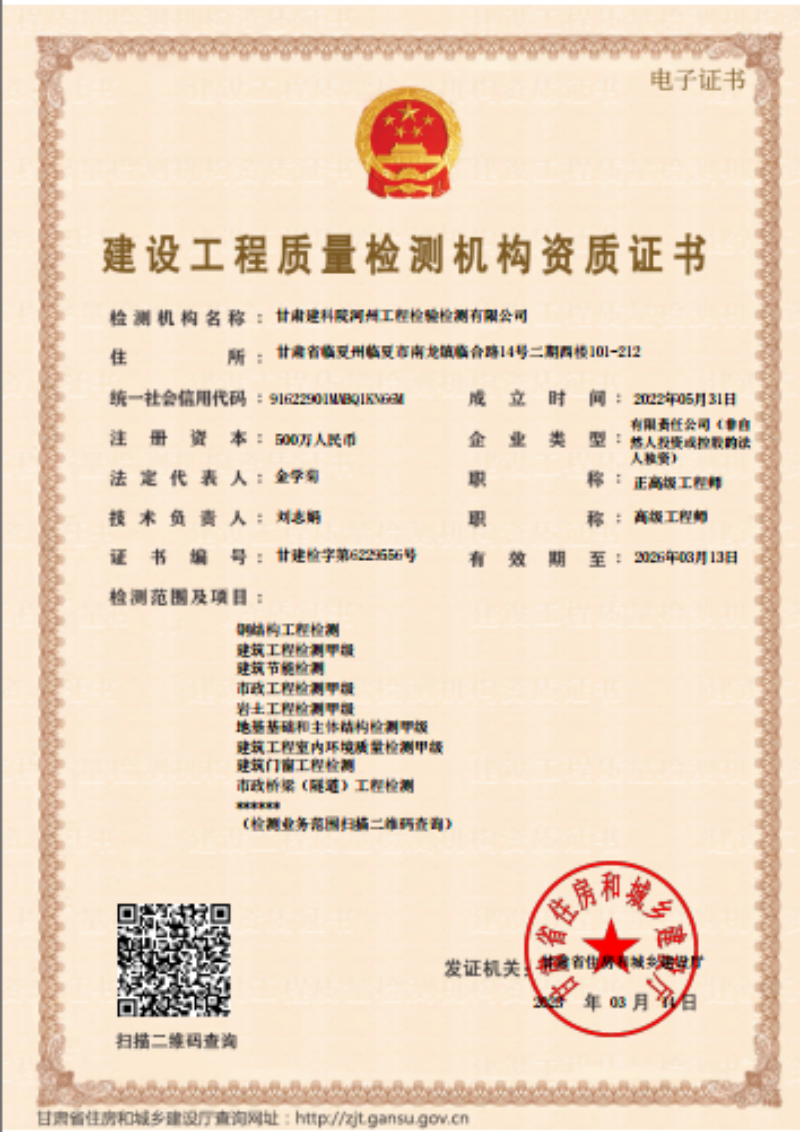 喜訊! 甘肅建科院河州公司取得建設工程質量檢測機構資質證書