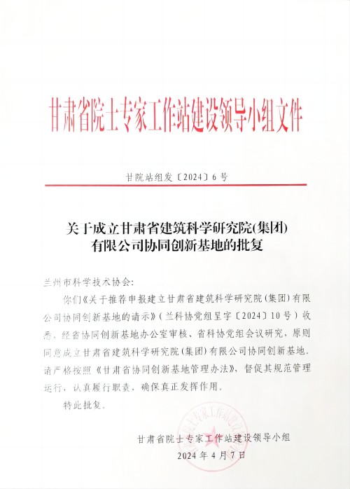 近日,從甘肅省科協(xié)獲悉,由甘肅建科院公司申報的“甘肅省建筑科學(xué)研究院(集團)有限公司協(xié)同創(chuàng)新基地”獲甘肅省院士專家工作站建設(shè)領(lǐng)導(dǎo)小組正式發(fā)文批復(fù)成立,并獲專項資助經(jīng)費20萬元。這是甘肅建科院公司獲批成立的第一個引進院士專家團隊的科研創(chuàng)新平臺,也標志著甘肅建科院公司在高水平科研平臺建設(shè)方面邁出了堅實一步。