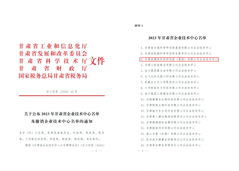 近日,從甘肅省工信廳獲悉,甘肅建科院成功獲批甘肅省企業(yè)技術(shù)中心。此次甘肅建科院獲批省級(jí)企業(yè)技術(shù)中心,是政府行業(yè)主管部門對(duì)公司創(chuàng)新能力及創(chuàng)新成果的肯定,代表著公司科技創(chuàng)新水平與科技創(chuàng)新實(shí)力處于省內(nèi)行業(yè)領(lǐng)先地位,標(biāo)志著公司品牌形象及綜合實(shí)力再上新臺(tái)階。