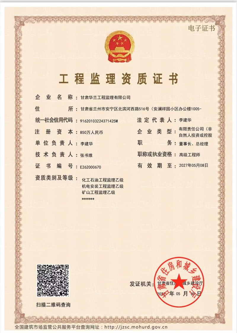 在建科院(集團)公司的大力支持下,甘肅華蘭工程監理有限公司近日成功取得甘肅省住房和城鄉建設廳頒發的化工石油工程專業監理乙級資質。