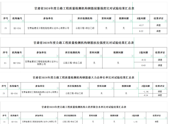2024年12月31日甘肅省交通建設質量造價中心公布了2024年度公路工程試驗檢測機構及工地試驗室比對試驗結果,甘肅建科院再獲佳績。鋼筋屈服強度、抗拉強度、最大力總伸長率、重量偏差、土的界限含水率(液限和塑限聯合測定法)五項檢測參數均取得滿意結果。