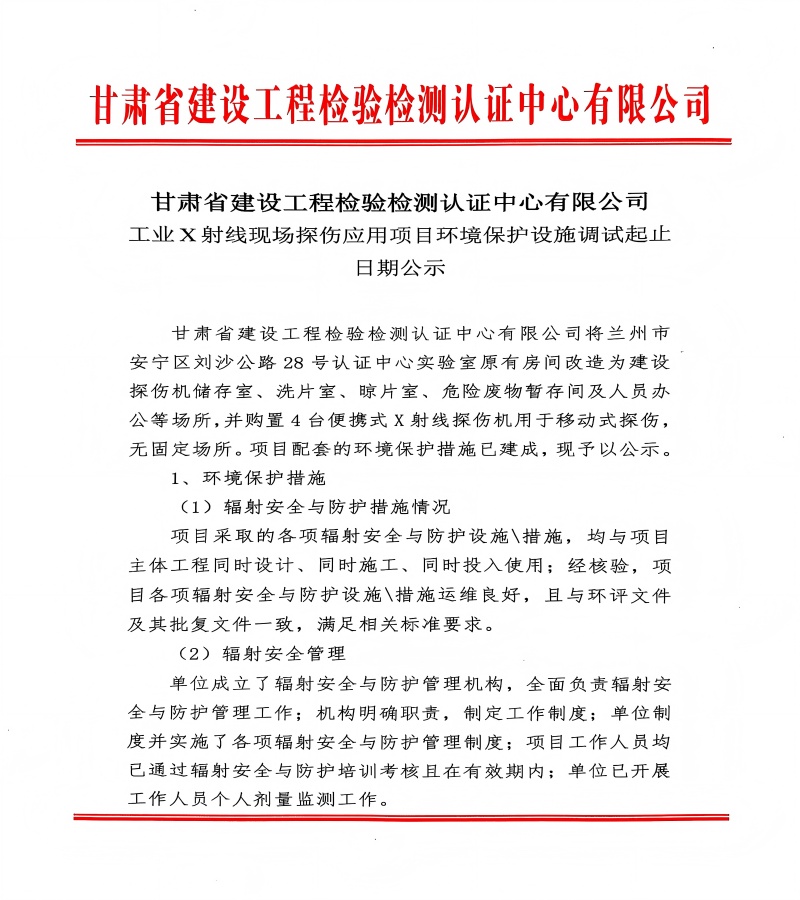 工業X射線現場探傷應用項目環境保護設施調試起止日期公示
