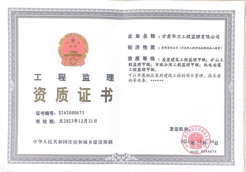 2023年是華蘭監理公司成立三十周年,在甘肅建科院的大力支持下,甘肅華蘭工程監理有限公司近日成功取得住房和城鄉建設部頒發的礦山工程監理甲級資質。